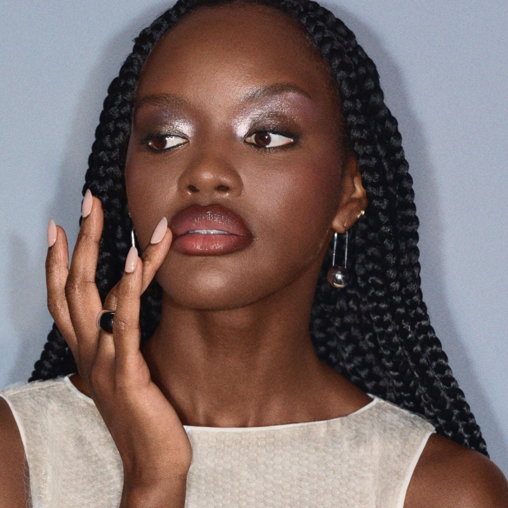 From office parties to meeting the parents, this shimmering nude makeup look is perfect for every holiday affair. “Satin-finished skin, defined features and a classic, brown-lined lip – accented with molten silver on the eyes – is like a pop of light from the future,” says Gloss. You’ll be shining at every event – from every angle – with this soft glam look.