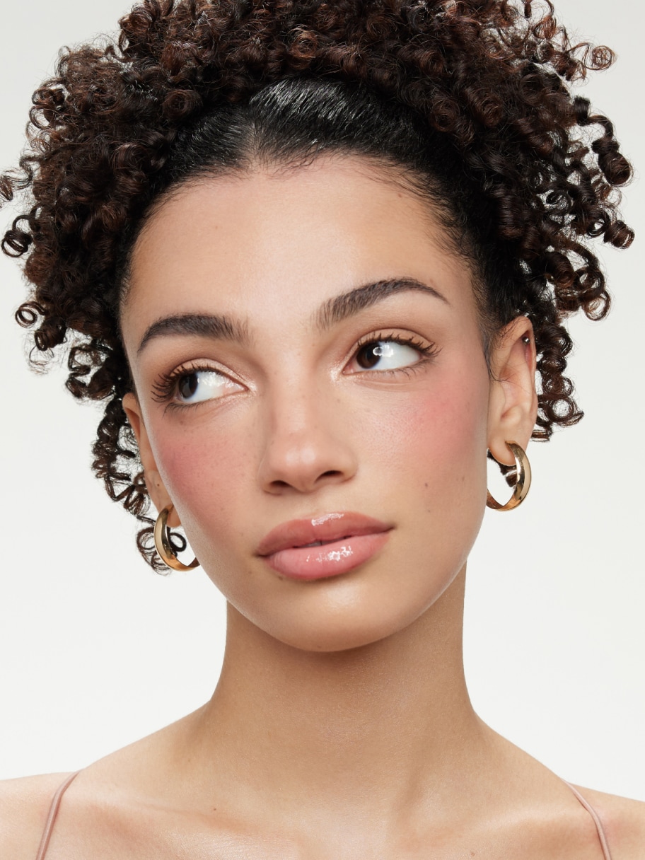Put blush front and center with sheer, soft-focus skin and a glassy finish.